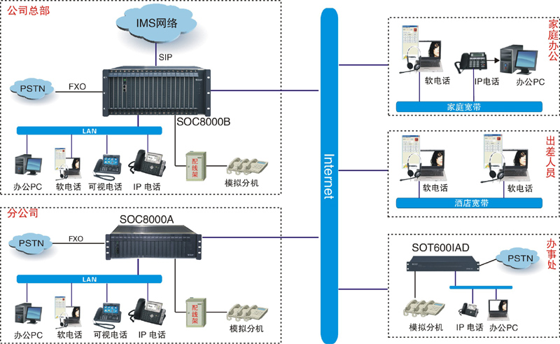 Ø 公司總部:在總部機(jī)房部署一臺SOC8000IPPBX,單機(jī)最大容量為1536線,通過SIP協(xié)議注冊到移動IMS平臺;同時(shí)提供E1/FXO接口與企業(yè)原電信運(yùn)營商連接;通過以太網(wǎng)口接入Internet局域網(wǎng);